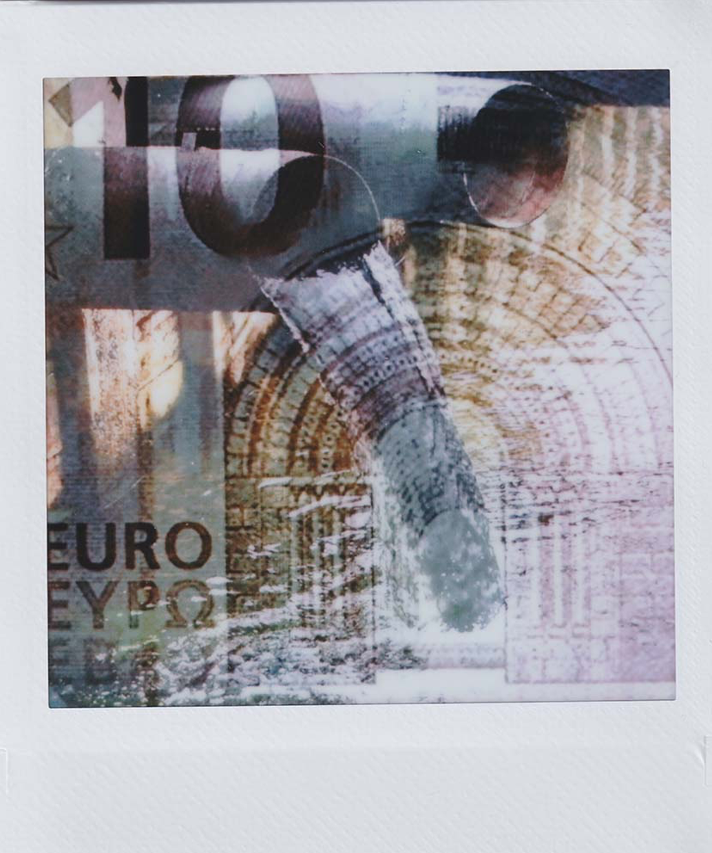 The instax has a double exposure feature, and what I’ve done was to photograph the bill and then a money-caused catastrophe, creating these images. Both images that comprise each fujiloide were taken form the internet; I photographed my computer screen.